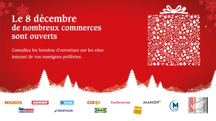 Même si le 8 décembre est un jour férié en Valais, la plupart des magasins ouvriront exceptionnellement leurs portes. Une belle occasion de faire vos achats de Noël en avance, tranquillement, et de profiter des animations proposées par les commerçants locaux.
