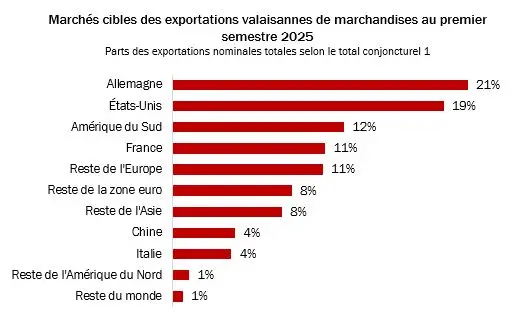 Im ersten Halbjahr 2025 war Deutschland mit 21 Prozent der wichtigste Exportmarkt des Kantons Wallis, gefolgt von den USA (19%). Ein seit August geltender US-Zusatzzoll von 39 Prozent (Ausnahmen: Pharma, gewisse Goldprodukte) belastet zwar die Wettbewerbsfähigkeit, dennoch sanken die Walliser Exporte in die USA bislang nur moderat um 4.4 Prozent. Im Gegensatz dazu führte die Wirtschaftsschwäche Deutschlands zu einem deutlich stärkeren Rückgang der Exporte nach Deutschland (-9.6%). Der starke Franken belastet zusätzlich die preisliche Wettbewerbsfähigkeit der Exporteure.