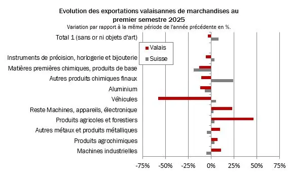 Im ersten Halbjahr 2025 sanken die Walliser Exporte um 3.6 Prozent. Gesamtschweizerisch stiegen die Exporte um 8.2 Prozent, vor allem durch vorgezogene Pharmaexporte zur Umgehung potenzieller US-Zölle. Dies spiegelt sich im kräftigen Zuwachs der Kategorie «Übrige chemische Endprodukte» wider, zu der auch Pharma gehört.